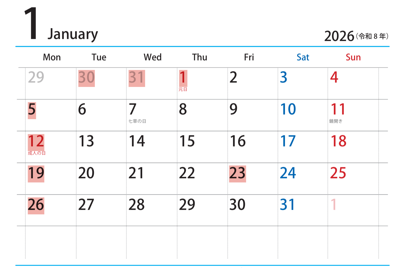 また、年始の閉店時間を1月2日(金)、3日(土)は17時、4日(日)18時とさせていただきます。
