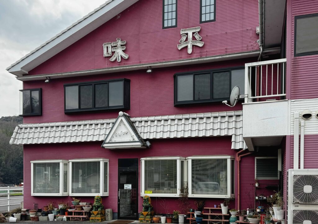山陽道の尾道ICから車で御調方面へわずか2分。遠くからでも分かるピンク色の建物が「味平」さんの目印です。店内はカウンター席、テーブル席、そしてゆったりとくつろげる座敷席があり、お一人様からご家族連れまで、どんな方でも気軽に立ち寄れるアットホームな雰囲気のお店です。