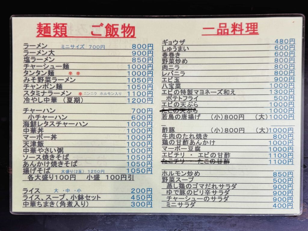 メニューはラーメンから中華系の一品料理まで一通り揃っています。