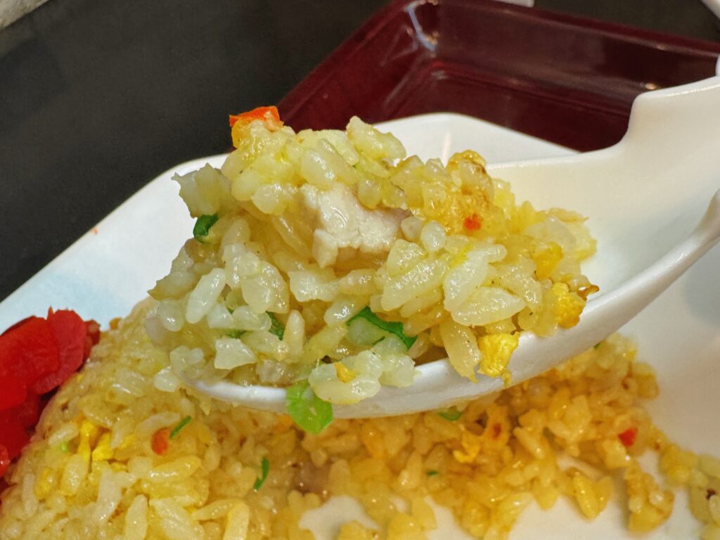ラーメンの優しい味わいと同じく、チャーハンも一口食べると、「ふわふわ」とした優しい口当たりの食感に驚かされます。しっとりでもなく、パラパラでもない、絶妙な食感です。