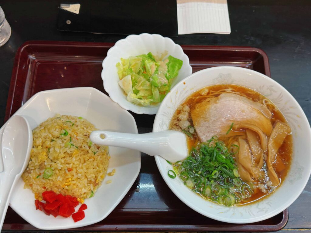 今回注文したのは、「ラーメン定食」です。チャーハンは普通サイズにしました。
