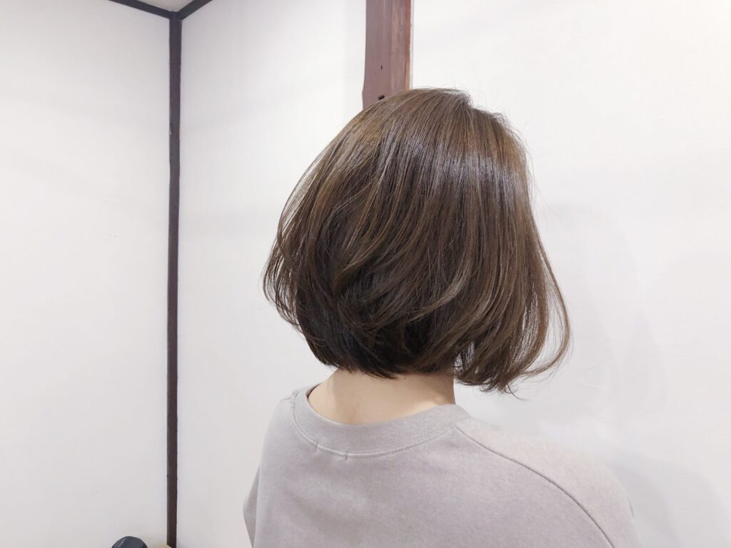 スタイル:前下がりボブをベースにトップにレイヤーカットを入れたボブスタイルです。軽さのあるボブスタイルにしたい方におすすめです。カラーは9トーンのベージュブラウンで染めています。9トーンくらいまでは白髪染めで対応できます。髪の長さやヘアスタイルのバランスなど調整可能ですのでご相談ください。